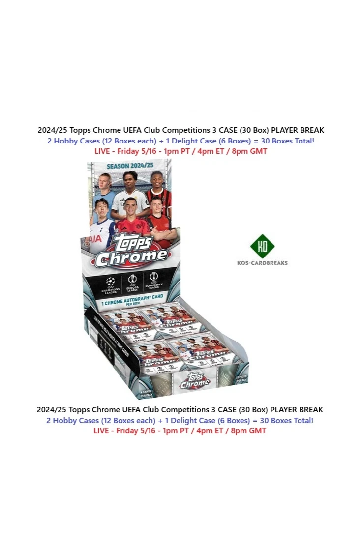 Join us live Friday for a 3 Case Player Break of Brand New 2024/25 Topps Chrome UEFA Club Competitions! 2 Hobby Cases + 1 Delight Case = 30 Boxes! Combined shipping w #2