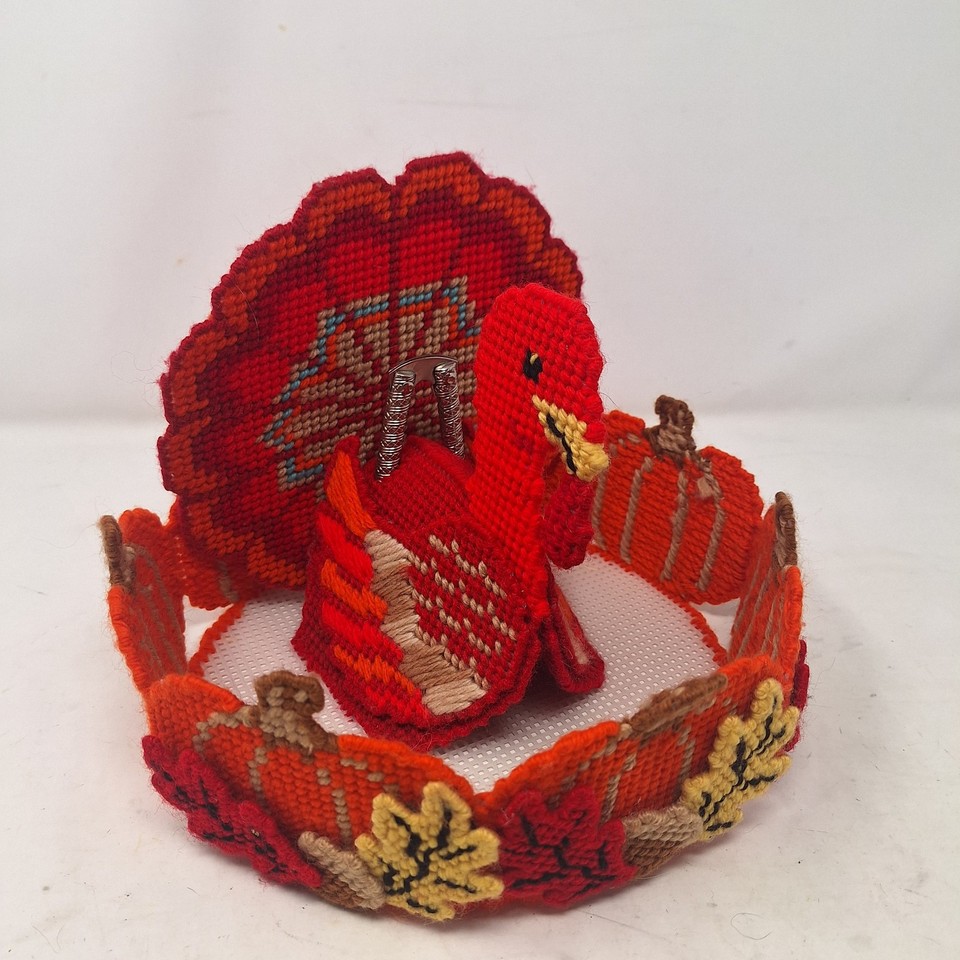 Vintage Thanksgiving Turkey Basket With Nutcracker Handmade Plastic Needlepoint