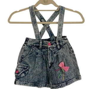 Vintage 1980s girls suspenders shorts romper light wash pink detailing 5/6