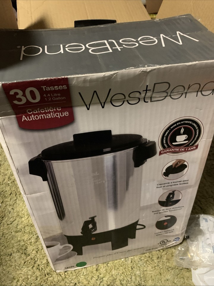 Handy for large gatherings, this West Bend 58030 coffee maker delivers 30 cups of tasty, fresh brewed coffee. Equipped with heat-resistant handles, lid, and base, as well as an automatic temperature control, this urn keeps coffee hot, while the outside remains safe to the touch. It’s twist-lock cover and two-way dripless faucet makes it easy for guests to serve themselves, without causing spills or messes. Interior water markings make it easy to fill and it brews coffee lightning fast, at a brew-rate of one cup per minute. Constructed of polished aluminum, this coffee urn is unobtrusive and functional.