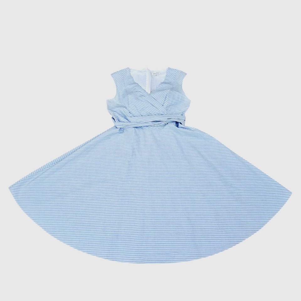 Calvin Klein Women 10 Sleeveless Faux Wrap Blue White Stripe V Neck Cotton Dress