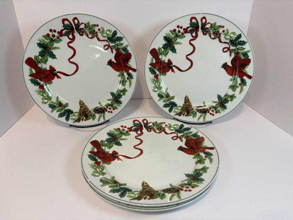 4 NEW Royal Norfolk Cardinal Christmas Red Ribbon Holly 10" Dinner Plate Set