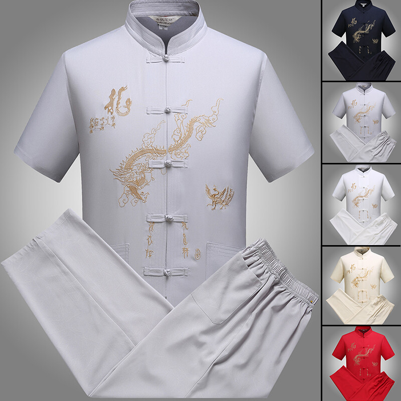 Mens Traditional Chinese Tang Suit Uniform Tai Chi T-shirt Suit Dragon Embroidey