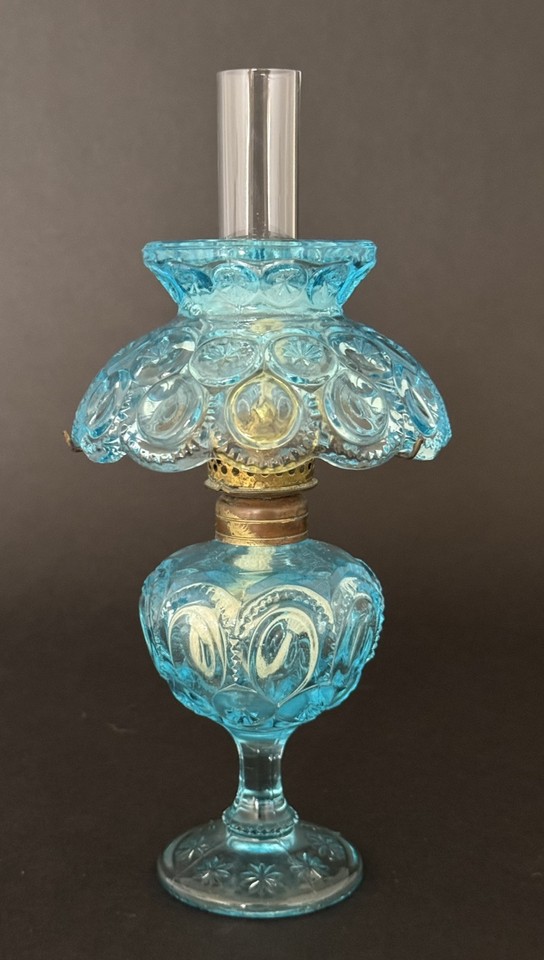 Vintage L.G. Wright Moon and Stars Mini Aqua Blue Glass Oil Lamp 9”