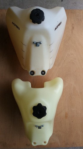 I prefer the thinner width and profile of this tank after using a 5.3 gallon Acerbis tank for several years. The natural color allows for easy reference of remaining fuel level while riding. Reference marks in one gallon increments are easily applied with a Sharpie or other marker.