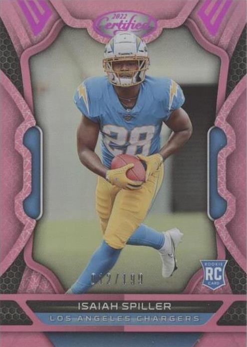 This 2022 Panini Certified Mirror Pink #110 Isaiah Spiller trading card is a must-have for any Los Angeles Chargers fan or football card collector. This card features a beautiful mirror pink design and is certified with a serial number for authenticity. As a rookie card, it is a valuable addition to any collection and is sure to increase in value over time. The card is manufactured by Panini and is part of the 2022 Panini Certified set. It is a sports trading card and is signed by the player Isaiah Spiller, making it a great gift for any fan.