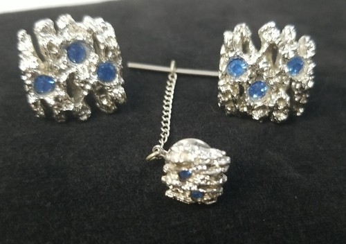 Vintage mid century nugget style silver tone blue stone cufflink tie tac set