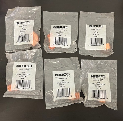 Nibco Lot Of 6 Parts 604 Male 1/2” 617 Cap 1/2” 607 90 Elbow 1/2”