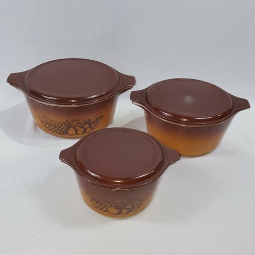 Pyrex 3 Casserole Old Orchard Corning Vintage Baking Dish Set & Lids 473 474 475