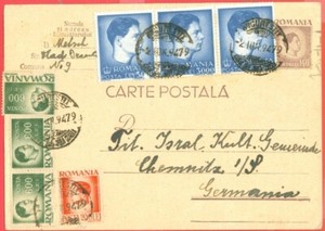 - New ListingRomania Stationary Post Card Up-rated cover to Germany 1947Opens in a new window or tabEUR 2.83Top Rated SellerTop Rated Seller0 bids · Time left6d 12h left (Thu, 03:01 PM)sanu108 (7,228) 100%+EUR 2.07 shippingfrom United States