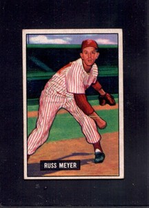 - 1951 Russ Meyer Bowman #75 Phillies Rookie Baseball CardOpens in a new window or tabPre-OwnedEUR 9.22rochestersports (37,978) 99.7%List price: Previous PriceEUR 11.25 18% offBuy It Now+EUR 16.49 shippingfrom United States