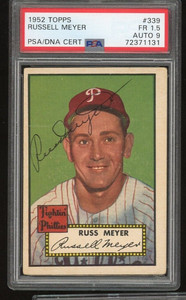 - 1952 Topps #339 Russ Meyer Phillies PSA/DNA MINT 9 authentic AUTOGRAPH signedOpens in a new window or tabEUR 324.34vintagecollectorscards (2,529) 97.6%0 bids · Time left3d 6h left (Sun, 07:48 PM)+EUR 25.96 shippingfrom United States