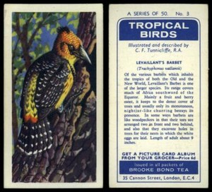 - Brooke Bond Tropical Birds #3 Levaillant's Barbet Tea Card (A) (CC131)Opens in a new window or tabPre-OwnedEUR 3.08Top Rated SellerTop Rated SellerBuy It Nowsonicmack (26,236) 100%+EUR 2.47 shippingfrom AustraliaSponsored