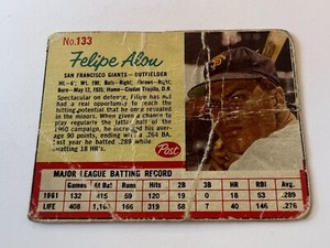 - 1962 POST #133 FELIPE ALOU-6--GIANTS--NO CREASES--EX/MT+Opens in a new window or tabEUR 3.53winndixie21 (13,189) 100%+EUR 17.80 shippingfrom United States