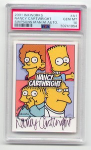- Nancy Cartwright autograph card 2001 Inkworks Simpsons Mania! A1 PSA 10 Pop 3Opens in a new window or tabNew (Other)EUR 1,852.471dayshow (7,228) 100%or Best Offer+EUR 75.63 shippingfrom United States