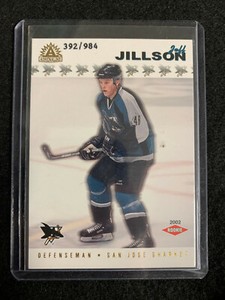 - 2001-02 Pacific Heads Up JEFF JILLSON Rookie RC /999 San Jose Sharks #118 HockeyOpens in a new window or tabPre-OwnedEUR 3.18wallbangr7 (4,260) 100%Was: Previous PriceEUR 3.53 10% offBuy It Now+EUR 17.75 shippingfrom United States