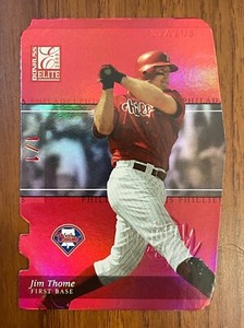- 2003 Donruss Elite National Die Cut Status Red Jim Thome 1/1 Phillies AAOpens in a new window or tabPre-OwnedEUR 42.81Top Rated SellerTop Rated Seller6 bids · Time left1d 14h left (Wed, 08:03 PM)jobystore (6,920) 99.5%+EUR 9.31 shippingfrom Taiwan