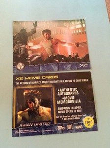 - Promo P1 Promotional Wolverine X2 X-Men United 2 Topps 2003 Hugh Jackman MarvelOpens in a new window or tabPre-OwnedEUR 3.63thatsentertainmenttoys (3,430) 99.6%Buy It Now+EUR 14.19 shippingfrom United States
