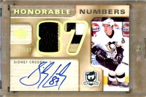 - 2005-06 The Cup Honorable Numbers #HNSC Sidney CROSBY RC Dual Patch Auto /87Opens in a new window or tabPre-OwnedEUR 10,896.76Top Rated SellerTop Rated SellerWas: Previous PriceEUR 12,819.72 15% offhobbycardsforsale87 (6,629) 99.9%Buy It Now+EUR 27.29 shippingfrom Canada17 watchers