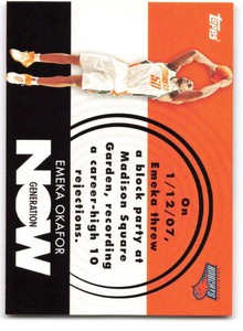 - 2007-08 NBA Topps Generation Now Insert Card Mint #GN7 Emeka OkaforOpens in a new window or tabPre-OwnedEUR 1.53discoun_4 (2,922) 98.9%or Best Offer+EUR 15.86 shippingfrom Australia
