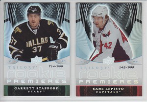 - 2008-09 UD TRILOGY GARRETT STAFFORD ROOKIE /999 #142 Premieres RC Upper StarsOpens in a new window or tabPre-OwnedEUR 4.09Top Rated SellerTop Rated Selleror Best Offerjoe_shaker (8,704) 100%+EUR 8.87 shippingfrom Canada