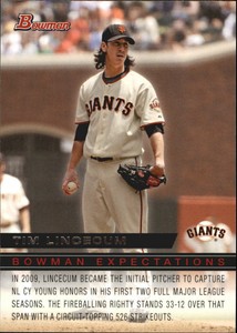 - 2010 Bowman Tim Lincecum Bowman ExpectationsOpens in a new window or tabPre-OwnedEUR 2.33brewsbreaks (16,574) 100%+EUR 15.72 shippingfrom United States