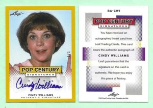 - CINDY WILLIAMS 2013 Leaf Pop Century GOLD Autograph #'d 1/1 LAVERNE & SHIRLEYOpens in a new window or tabEUR 284.70krazykardzandthangz (2,044) 100%+EUR 28.44 shippingfrom United States