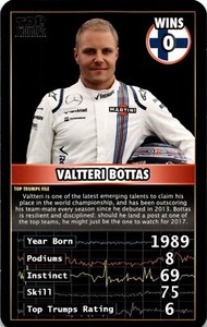 - 2016 Top Trump F1 Formula One Grand Prix Heroes Valtteri Bottas RookieOpens in a new window or tabPre-OwnedEUR 12.37svacards (17,308) 99.9%Was: Previous PriceEUR 13.74 10% offBuy It Now+EUR 15.48 shippingfrom United States