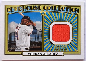 - Yordan Alvarez 2021 Topps Heritage Clubhouse Collection Relic Orange CCR-YAOpens in a new window or tabPre-OwnedEUR 9.26allcollectorssportscards (1,044) 100%+EUR 2.75 shippingfrom United States