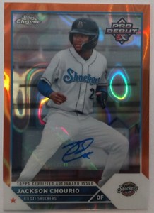 - Jackson Chourio Orange Lava Refractor Auto /25 2023 Topps Pro Debut ChromeOpens in a new window or tabPre-OwnedEUR 371.00jdhaugh11 (5,647) 100%or Best Offer+EUR 28.34 shippingfrom United States