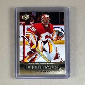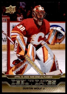 - 2023-24 UPPER DECK DEBUT DATES GOLD DUSTIN WOLF CALGARY FLAMES #DD-5Opens in a new window or tabPre-OwnedEUR 12.65Top Rated SellerTop Rated Selleror Best Offercollectosports (12,100) 100%+EUR 12.27 shippingfrom Canada