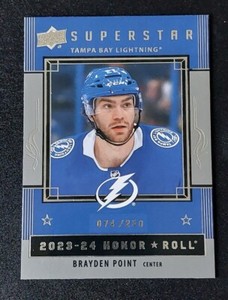 - New Listing2023-24 Upper Deck Superstar Honor Roll BRAYDEN POINT #HR-21 Tampa Bay LightningOpens in a new window or tabPre-OwnedEUR 1.85Top Rated SellerTop Rated Sellercardboardking (8,101) 100%+EUR 16.48 shippingfrom Canada