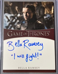 - Bella Ramsey "I will fight!" INSCRIPTION Autograph card - Game of ThronesOpens in a new window or tabPre-OwnedEUR 171.87Top Rated SellerTop Rated Seller14 bids · Time left1d 11h left (Sat, 02:32 PM)comicbooks2go (6,167) 100%+EUR 18.84 shippingfrom United States