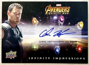 - REDUCED: CHRIS HEMSWORTH SIGNED 2018 Upper Deck Infinity War! II-CH Thor! Rare!Opens in a new window or tabGreat Chance To Own An Authentic Marvel Signed CardPre-OwnedEUR 664.28mmpopartifacts (1,661) 100%0 bids · Time left14h 57m left (Fri, 02:03 PM)EUR 1,110.31Buy It Now+EUR 44.09 shippingfrom United States
