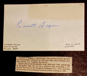- EVERETT FAGAN Signed/AUTOGRAPHED index card debut 1943 Philadelphia AthleticsOpens in a new window or tabEUR 18.68Top Rated SellerTop Rated Sellercollectorsworld-va (40,820) 99.9%+EUR 15.04 shippingfrom United States