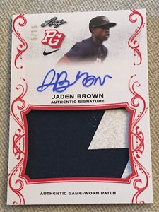 - 2018 Leaf Perfect Game Jaden Brown Auto Patch Jersey #PA-JB1 Card /25Opens in a new window or tabPre-OwnedEUR 9.44lvrollers (7,384) 99.4%+EUR 14.82 shippingfrom United States
