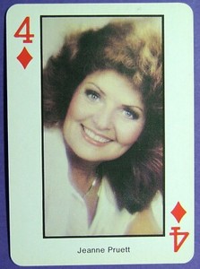- Jeanne Pruett Country Music Singer Single Swap Playing Card 4 DiamondsOpens in a new window or tabPre-OwnedEUR 1.8125% off 5+Top Rated SellerTop Rated Seller+EUR 11.39 shippingmountain_blessed_2 (7,618) 99.9%from United States