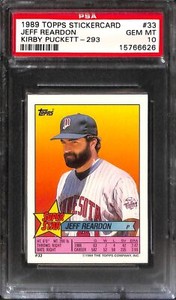 - 1989 TOPPS STICKERCARD JEFF REARDON #33 KIRBY PUCKETT-293 PSA 10 15766626Opens in a new window or tabNew (Other)EUR 23.35Top Rated SellerTop Rated Seller0 bids · Time left2d 9h left (Sat, 06:23 PM)sports-cards-forever (20,365) 99.9%+EUR 21.76 shippingfrom United States