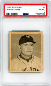 - 1948 Bowman Johnny Mize #4 PSA 2 GiantsOpens in a new window or tabNew (Other)EUR 13.58boca_sports_cards (1,857) 99.7%4 bids · Time left1d 5h left (Sun, 06:06 PM)+EUR 20.28 shippingfrom United States