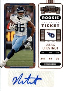 - JULIUS CHESTNUT AUTO Rookie 2022 Panini Contenders TICKET #274 Tennessee TitansOpens in a new window or tabPre-OwnedEUR 14.16Top Rated SellerTop Rated Sellergforce1 (44,329) 100%Shipping not specifiedfrom United States