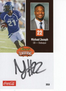 - MICHAEL JOSEPH Signed/Autographed 2018 SENIOR BOWL CARD Dubuque Spartans w/COAOpens in a new window or tabPre-OwnedEUR 5.03popham3sports (21,090) 100%Was: Previous PriceEUR 5.59 10% off+EUR 18.36 shippingfrom United States