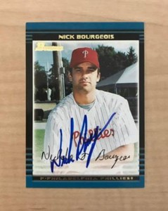 - NICK BOURGEOIS PHILADELPHIA PHILLIES SIGNED 2002 BOWMAN CARD #BDP24 W/COAOpens in a new window or tabPre-OwnedEUR 9.44allstarjef4ydp (59,917) 99.8%+EUR 17.65 shippingfrom United States