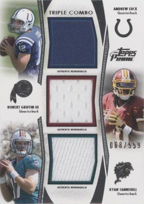 2012 Topps Prime - Triple Combo Relics Ryan Tannehill, Andrew Luck, Robert Griffin III #TCR-LGT /559 (MEM, RC)