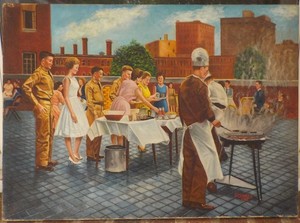 Vintage Painting , COOKOUT on City Roof, SOLDIERS & Women, Buffet Line, c1961