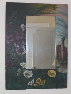 Antique Victorian , Green Hand-Painted FLOWERS & CASTLE , Folk Art Large MIRROR