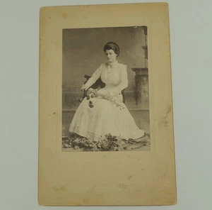 Antique Photo Cabinet Card Victorian Woman Adorn w/ Roses Name on Back 1880-90's