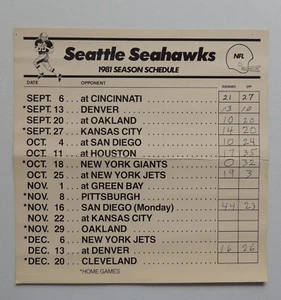 Seattle Seahawks NFL Season Schedule 1981 Football Score Card 11" X 11"