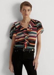 NWT LAUREN RALPH LAUREN BLACK LABEL Ruffled Neck Top Stripe Flutter Sleeve LARGE