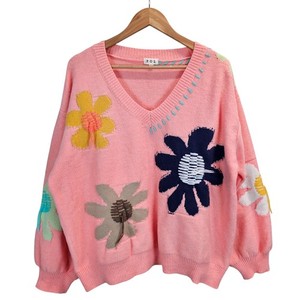 POL Oversized Pink Daisy Sweater V-Neck Floral Knit Retro Boho Cottagecore L