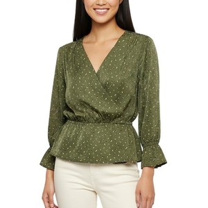 Oat Green Speckled V-Neck Peplum Blouse Long Sleeve Ruffle Cuff NWT Size L